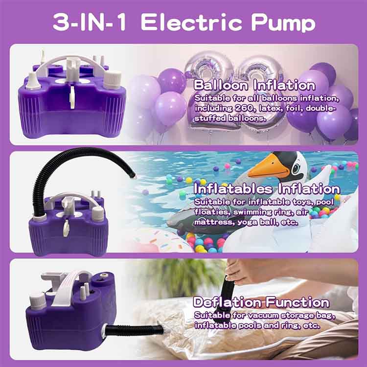 تم تجهيز مضخة البالون الكهربائية بـ 5 فوهات تضخم احترافية ، وخرطوم تمديد ، وإبرة مزدوجة ، وخرطوم التضخم بالكرة ، والتي يمكن أن تتعامل بسهولة مع معدات كبيرة مثل المراتب القابلة للنفخ ، وحلقات السباحة ، وكرات اليوغا ، والقوارب القابلة للتنفيس ، ويمكن أن تؤدي إلى تضخيم الكرات الرياضية بدقة مثل كرات السلة ، واللف جولات ، وكرات فوللي. يتم تضمين قاطع بالون خاص وعقدة ذكية بشكل خاص ، بحيث يمكن إجراء قطع البالون والعقدة في خطوة واحدة. حتى المبتدئين يمكن أن يكملوا بسرعة تشكيل بالون على مستوى المهنية.
