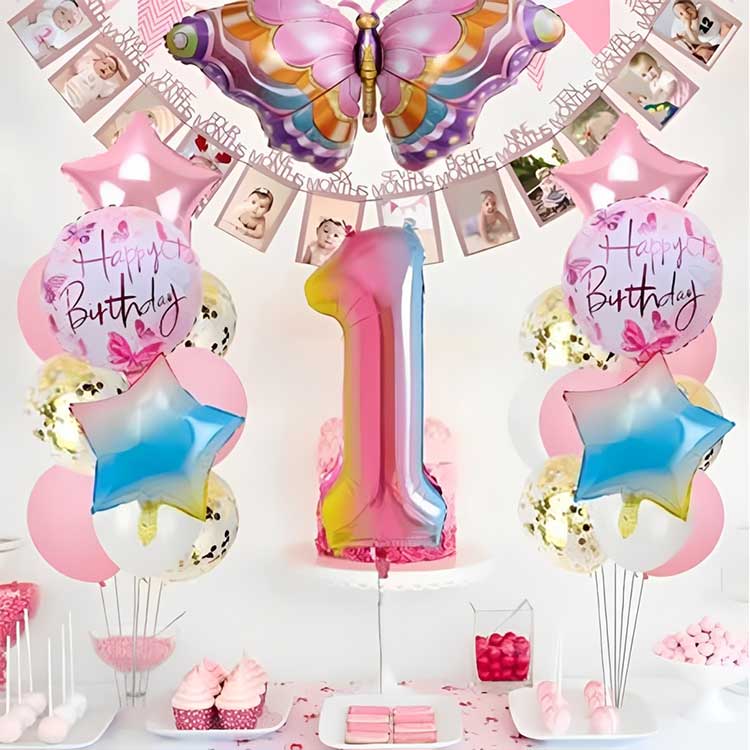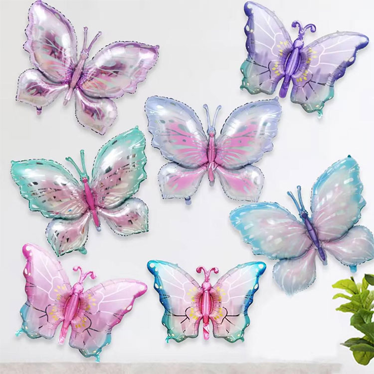 بالون فويل على شكل فراشة مصنوع من مادة فويل معدنية. هذه المادة لا تمنح البالون بريقًا وملمسًا فريدًا فحسب، بل تعمل أيضًا على تحسين متانة البالون ومقاومته للضغط بشكل كبير. الخصائص العاكسة للرقائق تجعل البالونات مبهرة بشكل خاص تحت الضوء، مما يزيد من التأثير البصري.