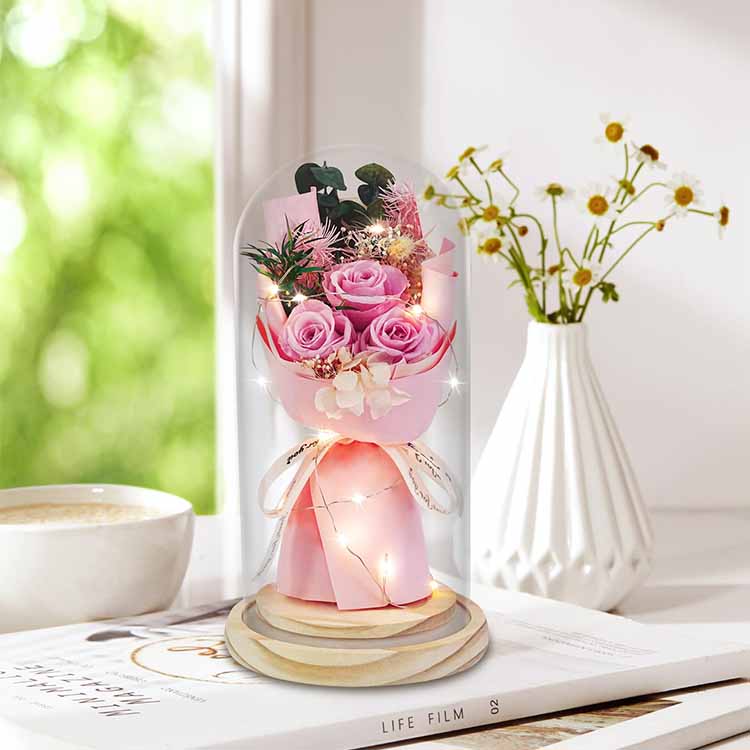 يتم استخدام باقة ورد الصابون ذات القبة الزجاجية مع LED مع زهور الصابون والزهور المحفوظة. تستخدم مصابيح LED ضوءًا دافئًا وغير ساطع، مما يمكن أن يضيف جوًا دافئًا عند تزيين المشاهد. تحتوي سلسلة ضوء LED المدمجة أيضًا على أضواء وامضة ملونة، ويمكن تخصيص الألوان لتلبية احتياجاتك. يمكن استخدام هذه الباقة ذات الغطاء الزجاجي لتعيين مشاهد، مثل أعياد الميلاد واحتفالات الذكرى السنوية والمقترحات وما إلى ذلك، ويمكن أيضًا تقديمها كهدية هدية.الزهور الدائمة لن تذبل ولن يتغير لونها حتى مع الغطاء الزجاجي. يمكن أيضًا استخدام زهور الصابون لغسل اليدين أو كعطر. باقة الورد هذه اقتصادية وعملية.