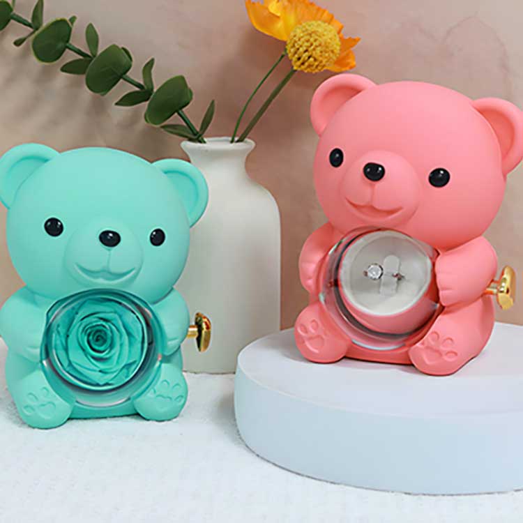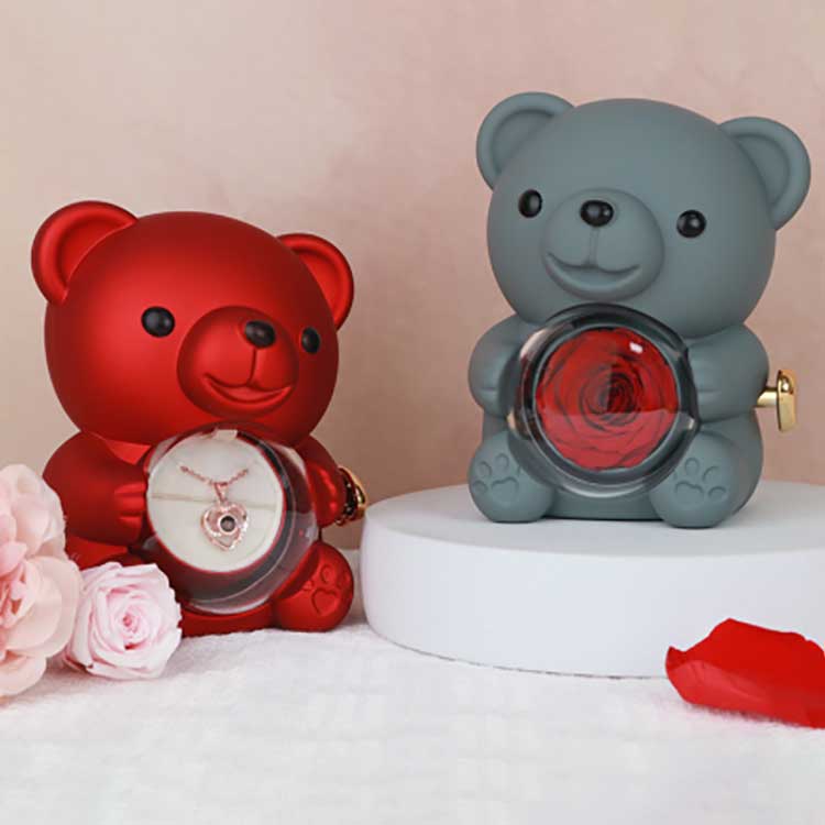 يُستخدم صندوق المجوهرات Hug Bear Rose هذا للعرض على المكتب أو رف الكتب أو طاولة السرير. الميزة الأكثر لفتًا للانتباه هي الوردة المحفوظة في المنتصف. يكشف فتح الوردة عن حجرة لتخزين المجوهرات أو الخواتم أو التذكارات.