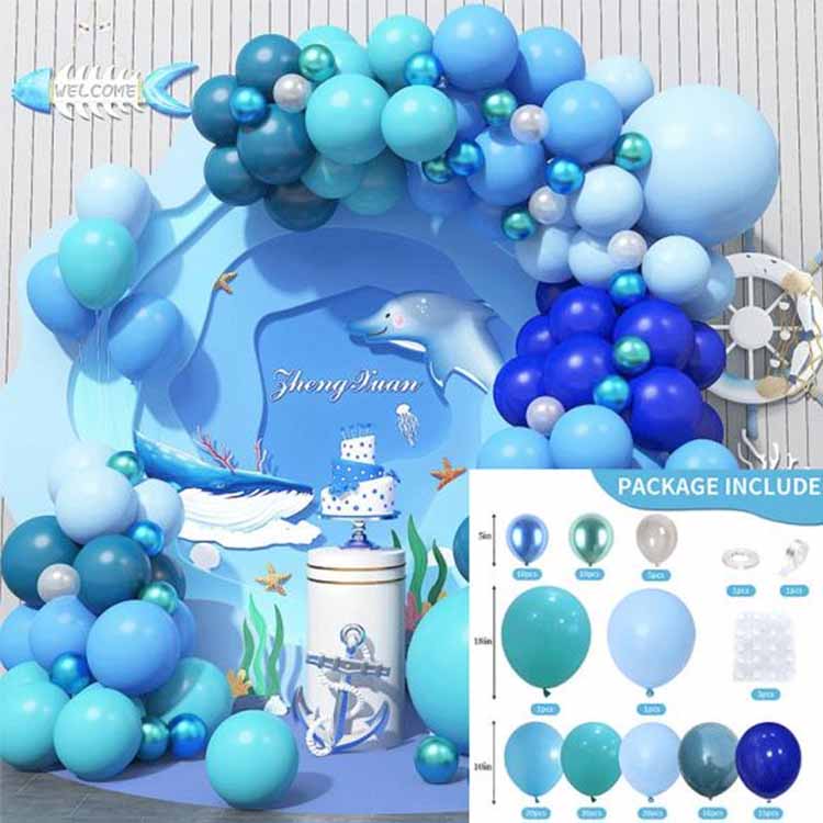 1. بالونات الألوان الأساسية: أزرق محيطي عميق، أزرق محيطي فاتح، أبيض، وشفاف (محاكاة مياه المحيط والأمواج والفقاعات)